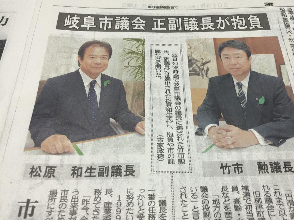 | 29日 | ・岐阜市PTA大会 ・正副議長就任挨拶回り(大垣市議会~山県市議会~可児市議会) ・岐阜☆青年市町村議員ネットワーク研修会・交流会 ・岐阜市役所金華会 |